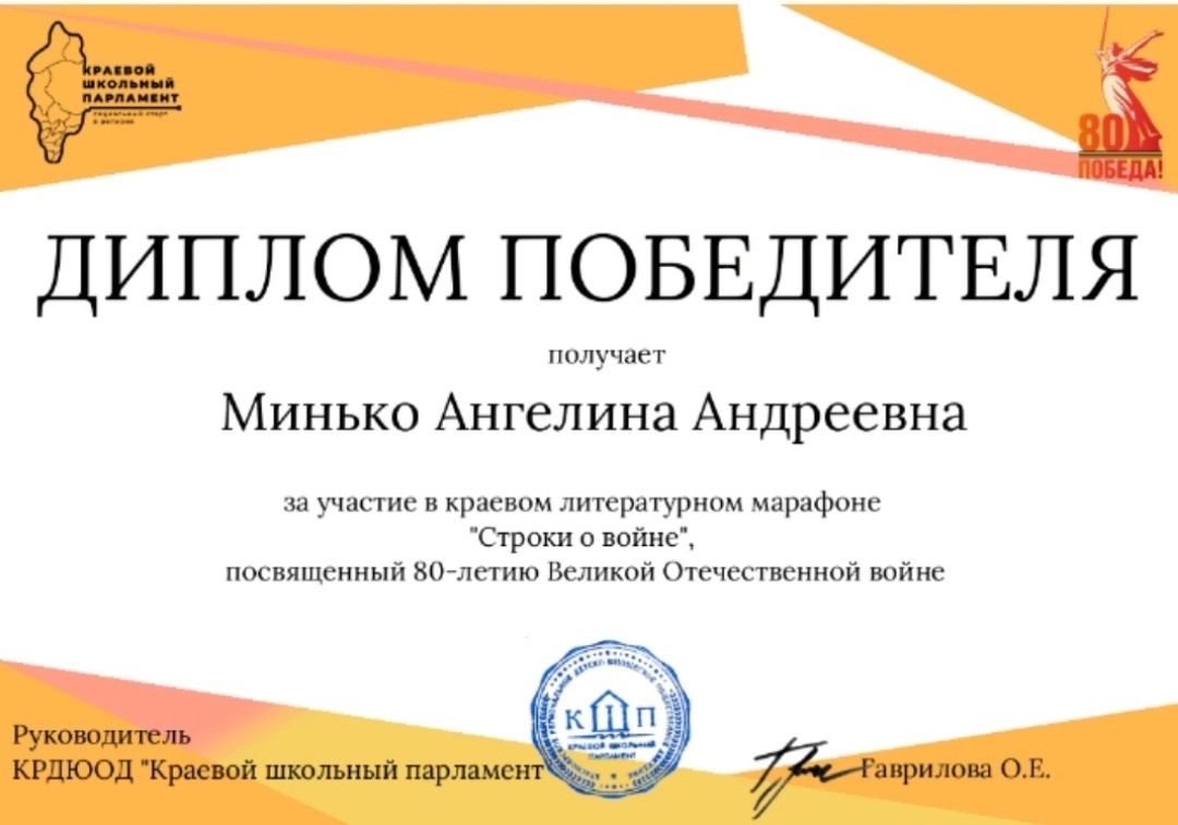 Диплом победителя за участие в краевом литературном марафоне "Строки о войне", посвящённый 80 - летию Великой Отечественной войне